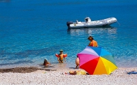 Strand: aprókavicsos, köves és betonos (kb. 80 m-re); lassan mélyülő részekkel; napernyők és nyugágyak felár ellenében