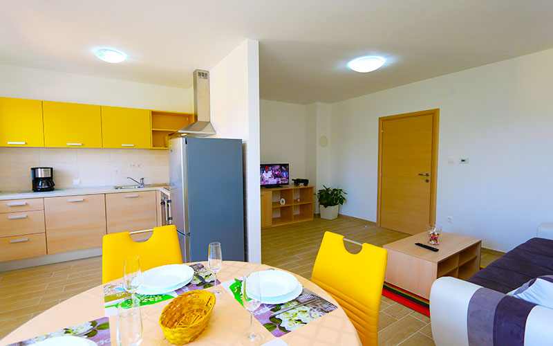 - 1/4+1 apt. (67 m2): két kétágyas hálószoba (mindkettőben franciaágy), a nappaliban kinyitható kanapé (2 fő részére)